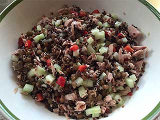 Ξεπλένω τις φακές και τις βράζω. Στραγγίζω και αφήνω να κρυώσουν. Ξεπλένω την κινόα την στραγγίζω σ\' ένα σουρωτήρι και την βράζω για 20 λεπτά σε αναλογία 1 μέρος κινόα προς 2 μέρη νερό. Την σουρώνω. Αφού κρυώσει, ανακατεύω όλα τα υλικά σ\' ένα μεγάλο μπωλ και αλατοπιπερώνω .
