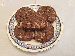 4) Αφήνω για λίγο το μίγμα στο ψυγείο και αφού σφίξει, πλάθω σε σχήμα κορμού. Το τοποθετώ στο ψυγείο για να σταθεροποιηθεί και κόβω σε φέτες.