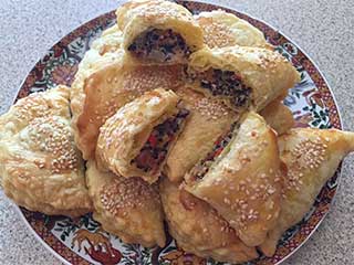 4) Μ\' αυτό το μίγμα, γεμίζω τα σφολιατάκια μου, τα αλείφω με αυγό και τα ψήνω στους 180-200 βαθμούς, πάνω-κάτω, μέχρι να ροδίσουν.
