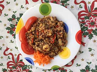 3) Σ\' ένα λεπτό σουρωτήρι ξεπλένω καλά την κινόα μου και 20 λεπτά πριν το τέλος την ρίχνω στο τηγάνι με τον κιμά για να μαγειρευτούν μαζί ( αν χρειαστεί προσθέτω ζεστό νερό ). Μετά από 20\' και αφού έχουν απορροφήσει τα υγρά, η σάλτσα μου είναι έτοιμη.