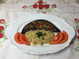 2) Βάζω στην κατσαρόλα 2 φλ. νερό. Ξεπλένω καλά την κινόα σ\' ένα σουρωτήρι και όταν βράσει το νερό την ρίχνω στην κατσαρόλα. Την βράζω περίπου για 20 λεπτά. Όταν πιει τα υγρά της και βγάλει μια μικρή άσπρη ουρίτσα απ\' το εσωτερικό της, αποσύρω από το μάτι. Όπως είναι ζεστή λούζω με λίγο βούτυρο ή μαργαρίνη, αλατοπιπερώνω και η γαρνιτούρα μου είναι έτοιμη.